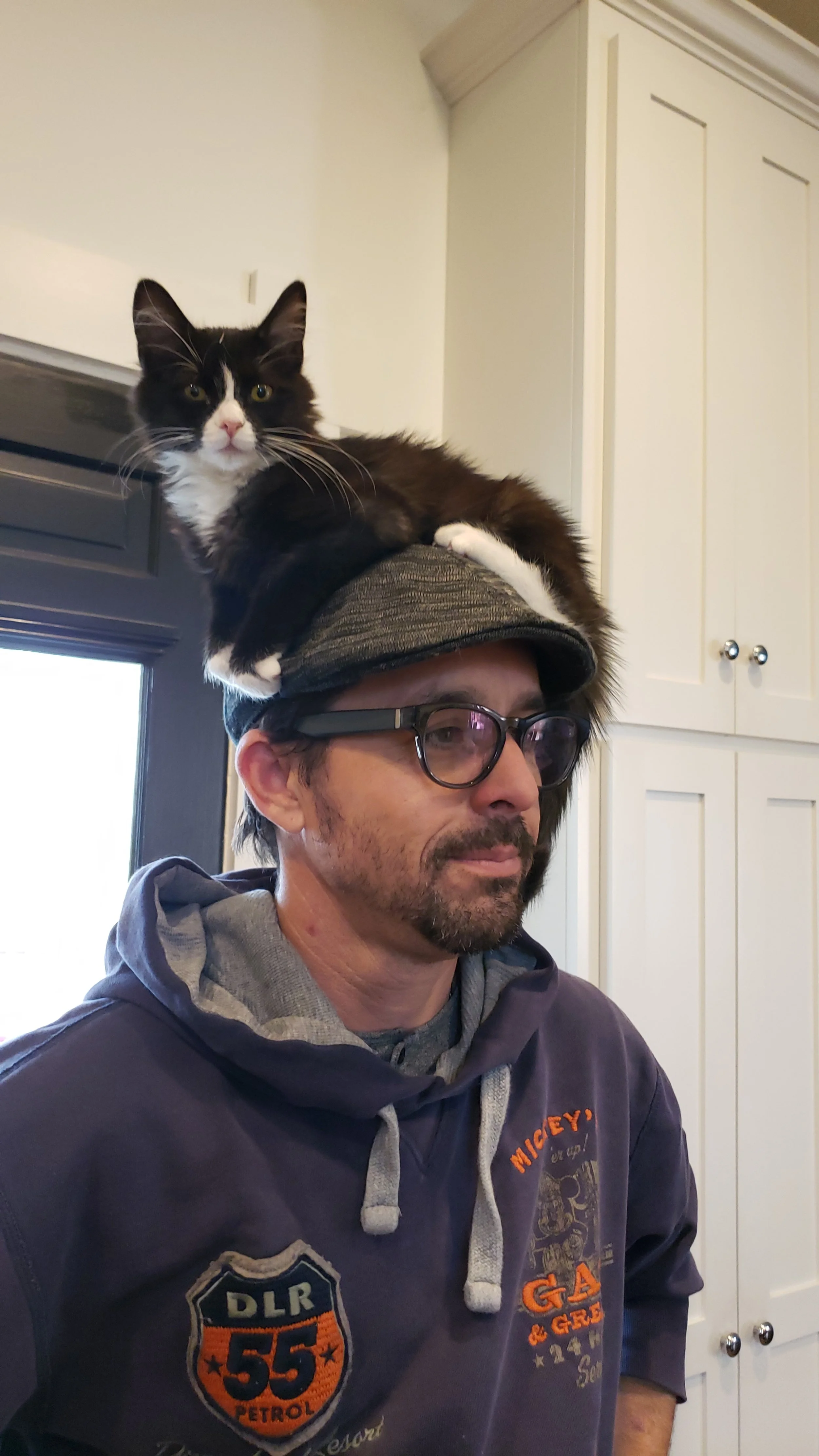 Without further ado, the cat leaped atop Adam's head, sitting as regally as any king on his throne. Feeling the soft weight of his new companion, Adam was suddenly filled with a sense of purpose and excitement.